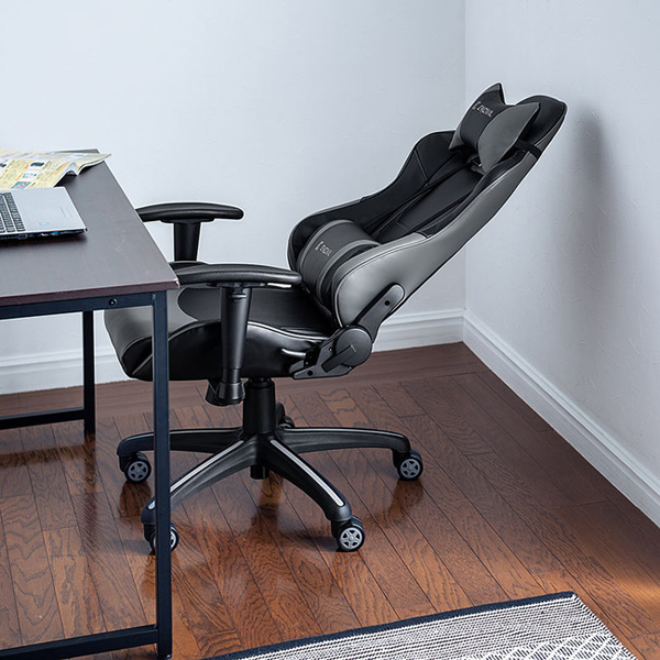 リクライニングの傾斜角度が最大150°で、寝ることができるくらい傾斜させることができる。また、座面ロッキング機能も搭載している。また、ヘッドレストとランバーサポートも標準で装備している。