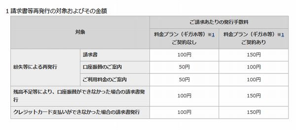 発行手数料は、紛失等による再発行の「口座振替のご案内」「ご利用料金のご案内」が50円、「残高不足等により、口座振替ができなかった場合の請求書発行」が150円など、再発行の対象やユーザーが契約しているプランによって異なる。
