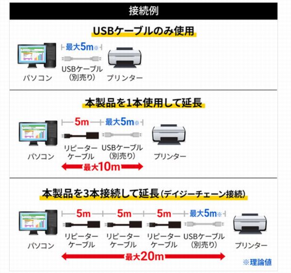 連結も最大3本まで対応し、通常のUSBケーブル(5m)につなげれば、最大で20m離れた機器同士を繋げることができる。