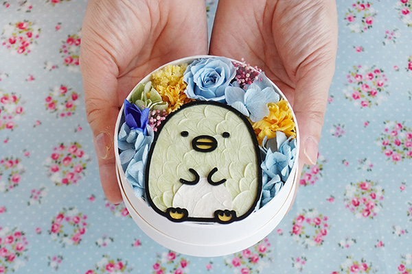 「すみっコぐらし フラワーコレクション」は、すみっコぐらしの仲間たちを描いたフラワーBOX。バラやかすみ草、あじさい、カーネーションなどのプリザーブドフラワーを使用している。デザインは6種類あり、しろくま、ぺんぎん?、とんかつ、ねこ、とかげ、えびふらいのしっぽ&あじふらいのしっぽを取り扱う。