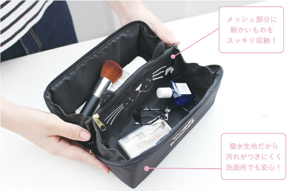 「pacapo.(R)マルチポーチ」は、猫のデザインがかわいいアイテム。パカポというかわいらしい名前のように、180度パカッと開くので収納した物を見分けやすい。撥水加工を施しているので洗面台などでも安心して使える。猫がデザインされたメッシュポケットは、中身が見えやすく、仕切りにも使えるので便利だ。