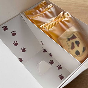 「今日のねこもよう」は猫の型抜きを体験できるプリントクッキー。まわりを割っていくことで猫の形にできるので、猫好きにはたまらないお菓子だ。クッキーは三層で、猫のプリントは全部で3種類。猫デザインのパッケージがかわいいだけでなく、箱の中まで肉球イラストをあしらっている。細部まで猫にこだわったかわいらしい仕上がりだ。