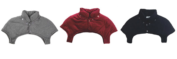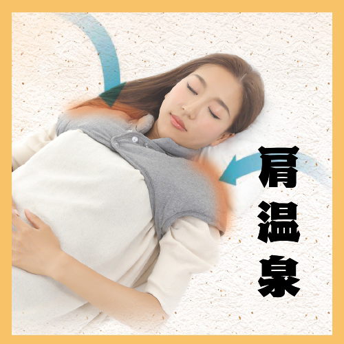 「肩温泉」は中綿に遠赤発熱コットン配合したウォーマー。肩から首まで生地で覆うことで隙間なく温めてくれる。袖を通す形になっているので、寝返りなどでズレる心配がない。襟部は取り外し可能で、重ね着することもできる。寝るときだけでなく、家事やテレワークといった自宅で過ごす時間に幅広く活用できるアイテムだ。
