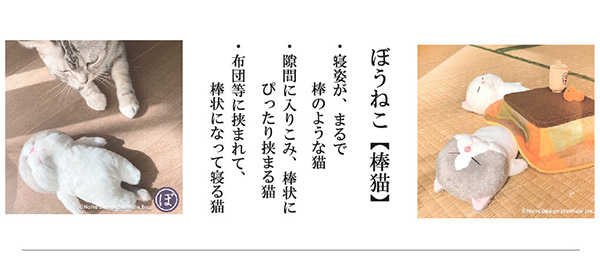 「ぼうねこ」のサイズは全長約16cmで、素材はポリエステル。種類は全5色あり、「ちゃぼう」「しろぼう」「ぐれぼう」「ねずぼう」「くろぼう」を取り扱う。
