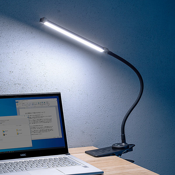 「800-LED040」は、バッテリーを内蔵したスティック型LEDライト。フレキシブルアームなので、照らす範囲を自由に変更できる。操作はタッチセンサー方式なので、触れるだけで光のオン・オフや調光設定を行える。スタンドだけでなく、クリップでデスクなどに挟んだり、台座底面のフック穴を使ってフック掛けしたりと、3WAYで設置可能。