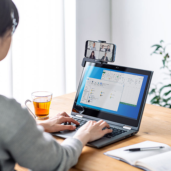 「200-STN054」は、スマホをサブディスプレイ化できるアイテム。ホルダー部分はボールジョイント式となっており、角度や向きを自由自在に調整できる。スマホ画面をノートPCのすぐそばに設置することで、電話やメールの通知に気づきやすい。