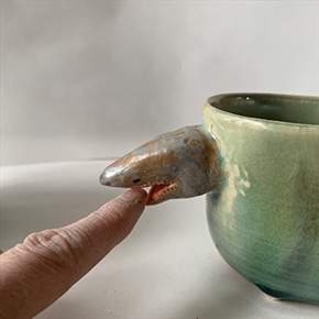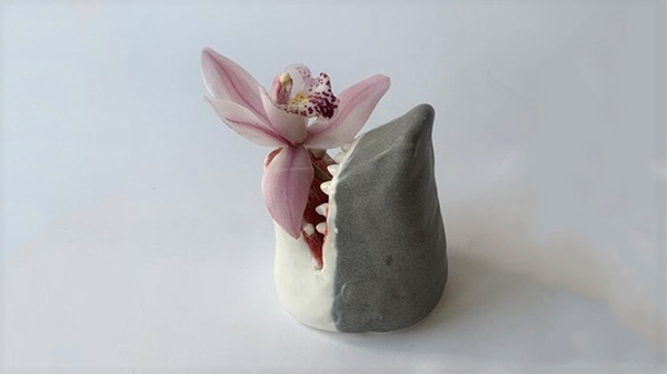 「サメの一輪挿し」サメの口に水をそそげる陶器の一輪挿し。サイズは高さ約9.5cm×幅約7.5cmで、販売価格は5,500円(税込)。