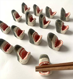 「サメ皿」は焼き魚をのせるのにちょうどいいサイズの長さ約18cm×幅9.5cm。販売価格は3,080円(税込)となっている。「サメの箸置き 2個セット」はサメがはしに食らいつく姿がかわいいアイテム。サイズは高さ約2.5cm×幅約2cmで、販売価格は2,860円(税込)。