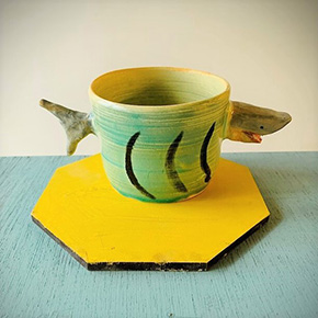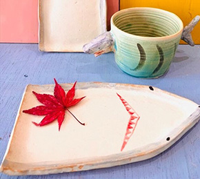 今回登場するグッズは、一輪挿しの花瓶、お皿、箸置き、マグカップ。サメの顔が愛らしい仕上がりとなっている。クリエイター田川亞希さんが制作しており、どの製品からもユーモアがあふれている。