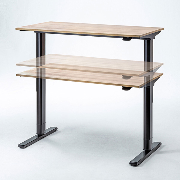 本製品は、レバーを引くだけで上下昇降できるデスク。ガスシリンダーを両脚に内蔵しているので、軽い力で簡単に高さを変えられる。立ち作業と座り作業をバランスよく組み合わせられるので、座りっぱなしや立ちっぱなしによる疲労を軽減することが期待できる。昇降範囲は高さ700mmから1134mmまでとなっている。
