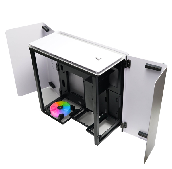 同製品は、トップとボトムのアルミ製パネルが翼を広げるように開閉するガルウィング開閉パネルを搭載したミドルタワーPCケース。90度に折れ曲がったL字型のパネルがヒンジにより可動し、ガルウィング方式で展開する。