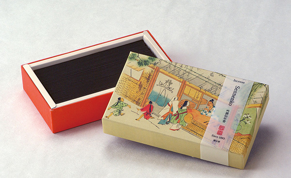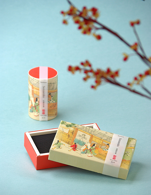 「吟撰仙年香 平箱」は、伝統的な香りを備えつつ現代風にリバイバルした線香。9種類の生薬を配合した奥深い香りにモダン調の香りを加えて、現代の部屋に合うよう煙を少なくしている。レトロなパッケージデザインには、明治時代に大阪画壇の日本画家によって描かれた絵を使用。町の薫香屋に立ち寄る女性たちと店主をいきいきと描いた作品だ。質感のある紙に印刷して丁寧に貼り合せている。使い終わったあとには小物入れとして使える上品なデザイン。