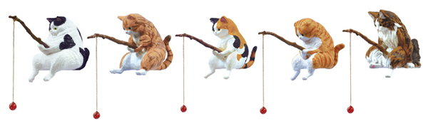 本商品は、机や棚の角や液晶ディスプレイの縁などに座らせることができるフィギュア。それぞれの猫たちは背中を丸め、まったり現実逃避しているかのような呆けた表情で釣りに興じており、眺めているだけで時間を忘れてしまいそうな雰囲気が表現されている。