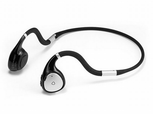 本製品は、耳の穴をふさがず、耳の手前の骨に当てることで音が聞こえるようにする骨伝導ヘッドセット。