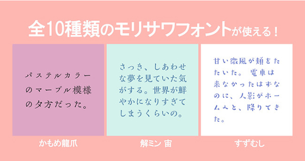 そこから、フォント/文字色/背景色を自由に変えて文章のイメージに合った装飾に仕上げることができ、フォントは株式会社モリサワによる全10種類の使用が可能。シェアボタンを利用して生成された画像をSNS共有すると、感想とともにTwitterで他のユーザーとつながれたり、誰かがシェアしたシーン画像から次に読む作品を探したりできる。