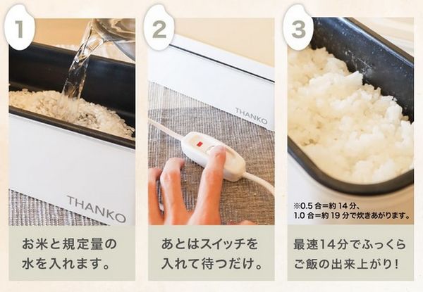 炊飯にかかる時間は、0.5合なら約14分、1合なら約19分で、お昼休みが始まってから炊飯を始めても、休憩時間中に炊きたてのほかほか御飯を食べることができる。