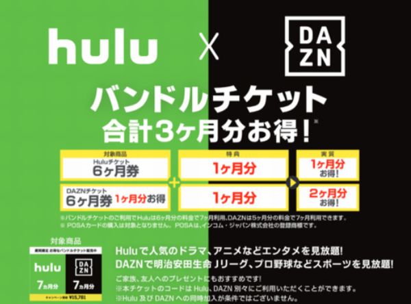 HuluとDAZNが初コラボ、月額料金が合計3ヶ月分お得になるプリペイドコードキャンペーン