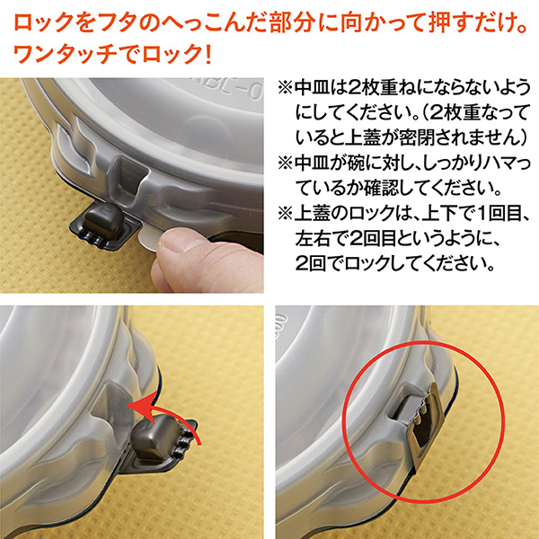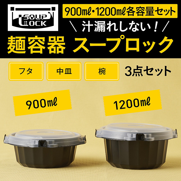「スープロック」は、特許技術のロック構造を採用した容器。麺類や汁物、スープ類のテイクアウトやフードデリバリーで、中身がこぼれないように持ち運びできる。ロックとアンロックを2タッチで操作でき、簡単かつ高い密閉性を実現している。椀、中皿、上蓋の篏合3点セット。