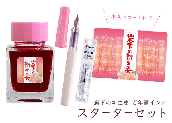 また、この「岩下の新生姜万年筆インク」をきっかけに初めて万年筆に触れるユーザーに向けて、岩下の新生姜ミュージアムと岩下の新生姜オンラインショップ限定で「岩下の新生姜万年筆インク スターターセット」も販売。ピンクの万年筆と、万年筆にインクを吸入する道具の「コンバーター」、セット特典のオリジナルポストカードがインクとともに同梱されている。「スターターセット」の価格は3,800円(税別)。