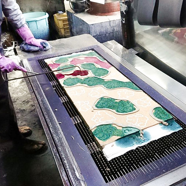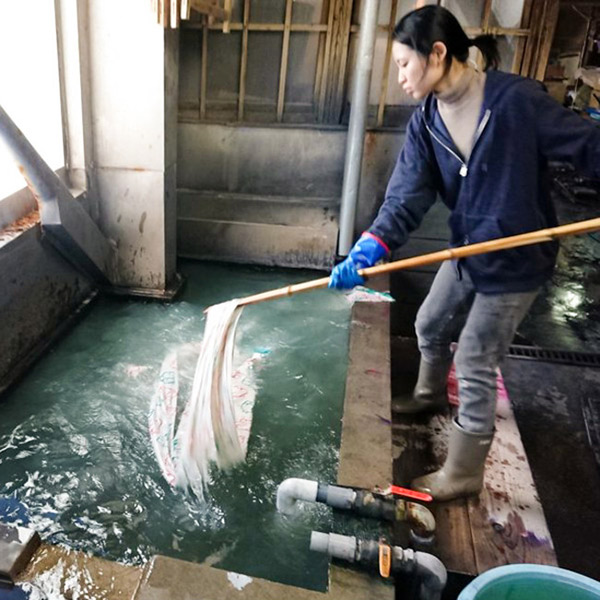 藤岡染工場は、新潟県阿賀野市水原の商店街にある創業270年の染物工場。ヒッコリースリートラベラーズとは、15年ほど前から一緒に手ぬぐいを使った商品開発を行っている。藤岡染工場の最大の魅力は、昔ながらの手作業が引き継がれていること。型をとるところから、染め、仕上げまでを一貫して手作業で進めている。