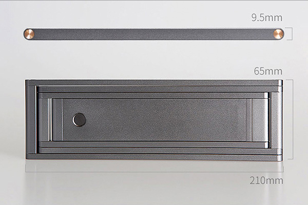「スマートライトV5A」のサイズは210mm×65mm×9.5mmで、重さは406g。1000mAh大容量リチウム電池を搭載しており、フル充電状態で4時間から10時間程度使用できる。カラーはグレーのみを取り扱い、素材にはアルミニウム合金を使用している。