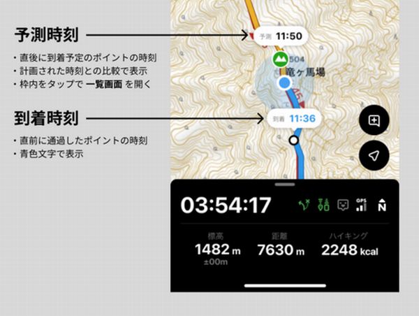 「到着時刻予測」は、登山者のペースを察知し、自動で目的地までの到着時刻を予測する新機能。