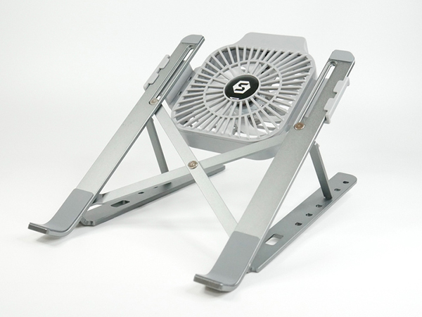 本製品は、アルミ合金製のスタンド。適度な傾斜で画面の位置を高く保ち、目線を上げる効果が得られるなど、快適な作業環境の構築に役立つ。さらに、このスタンドの大きな特徴は、着脱可能な冷却ファンが搭載されていること。約10cm角の大型ファンでノートパソコンへとしっかり送風でき、冷却性能を高めて熱によるパソコンのパフォーマンス低下を防げる。ファンのスピードは、背面に用意されたコントローラーで調節が可能。“静音”から“高冷却”まで、0〜2,100rpmの範囲内で回転速度を調整できる。