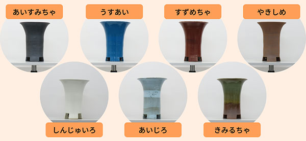 「POTTS」のサイズは上部直径26cm×高さ約35cmで、重量は約4.2kg。表面の仕上げは7種類あり、モダンな部屋やモノトーン統一にあわせやすい「あいすみちゃ」「しんじゅいろ」、部屋のアクセントになる「うすあい」「あいじろ」、和室や落ち着いた雰囲気に馴染む「きみるちゃ」「すずめちゃ」「やきしめ」を取り扱う。