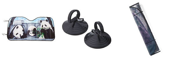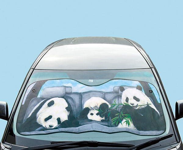 「パンダの親子のお留守番パンシェード」は、パンダの親子がごろごろくつろぐ姿やむしゃむしゃと食事する様子を取り上げたデザイン。駐車場でたくさんの車から自分の車を見つける際の目印として役立つだけでなく、駐車中の日差しを遮ることができる。取り付け方は吸盤が付属しているので、両サイドに装着してワンタッチで吸着するだけ。使用しない際には折りたたんでゴムで留めてコンパクトに収納可能。