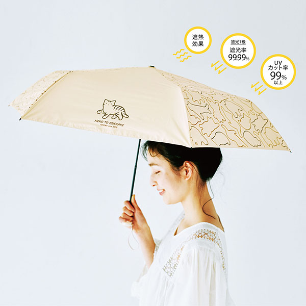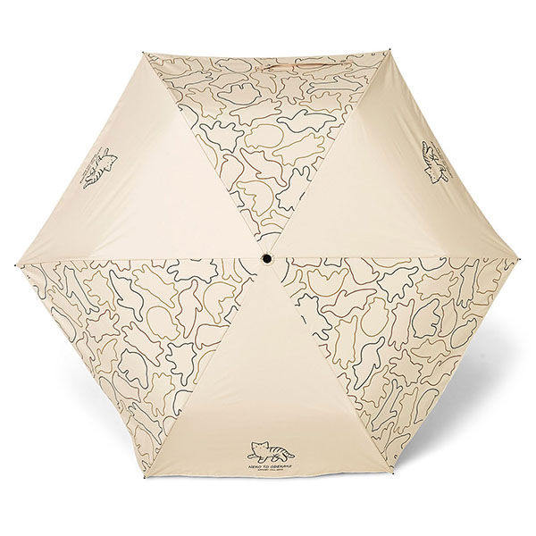 「UVカットおまかせニャ キジトラ猫さんの晴雨兼用傘」は、猫の総柄とキジトラ猫のワンポイントを交互に配置した大人が使いやすいデザイン。イラストレーター平澤南さんが描いたゆるいシルエット猫がかわいらしく、カラーはベージュをベースにしているのでさまざまな洋服に自然になじむ。コンパクトにたためる軽量タイプの傘なので、急な雨に備えてバッグに入れて持ち歩きがしやすい。
