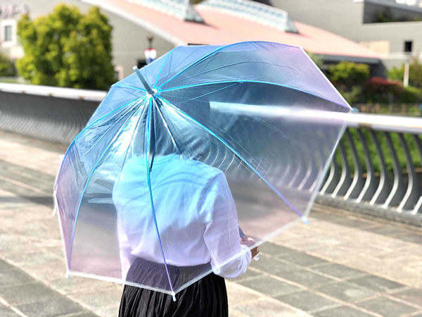 本製品は、カラフルなグラデーションが特徴のビニール傘。ビニールならではの透明感を生かし、オーロラやシャボン玉の色彩を想い起こさせる見た目に仕上がっている。通常のカラーに加えて、紫陽花のような色合いが特徴のパープル×ライトブルーの組み合わせも販売する。