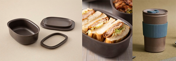 「BENTO box COFFEE」は、プラスチックを使っていない弁当箱。100%天然素材の「プラントファイバーセラミック(R)」で作られている。可燃ごみとして処分でき、土に埋めると半年ほどで分解が始まり完全分解する。形状は日本伝統のわっぱ弁当箱の楕円型、フタは台湾伝統のタイル模様をアレンジした曲線をデザインしている。
