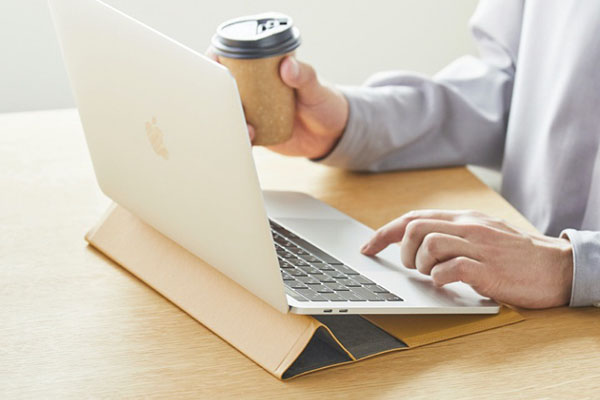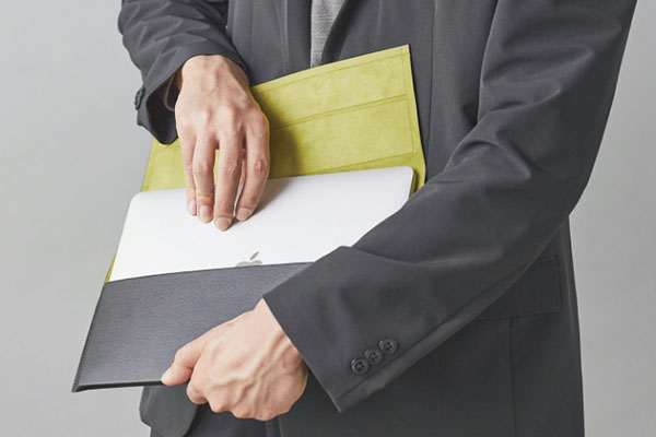 「MacBook用“MINIO”インナーケース」は、MacBookにフィットするシンプルなインナーケース。「うすく、かるく、スマートに。」をコンセプトとしており、縫い目がなく素材を活かすシンプルなデザインとなっている。上質なソフトレザー(ヴィーガンレザー)を使用しており、柔らかく肌触りが良い。ケースの内側に起毛素材を使用しているので、端末本体を滑らかに出し入れがしやすいだけでなく、端末の表面を傷つけにくい。作業がしやすいスタンド機能も備えている。
