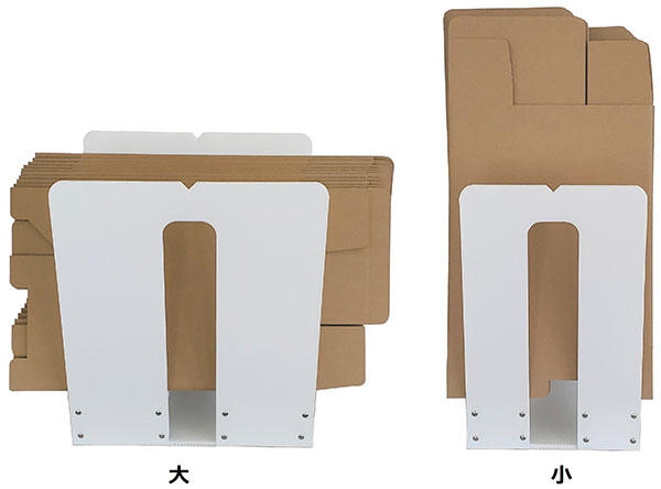「ダンボールストッカー」のサイズは大が25cm(幅)×35cm(奥行)×40cm(高さ)、小が25cm(幅)×25cm(奥行)×40cm(高さ)。材質はポリプロピレン、スチールとなっている。