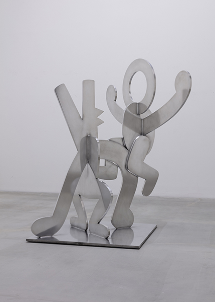 今回の展覧会の注目の1つは、1989年の彫刻作品の「無題(犬の上でバランスをとる人)」。キース・ヘリング氏の作品はビビッドな色彩のものが代表的だが、本作では生のアルミ素材が渋い輝きを放っており、彫刻の周りをぐるりと1周することで見る角度によって異なる像が現れる。そのほか、「サブウェイ・ドローイング」など、初期のキース・ヘリング氏の活動に密着した写真群も世界初公開。