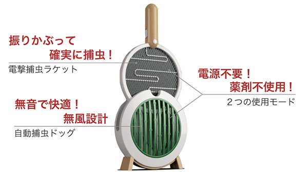 ほったらかし殺虫モードでは紫色の殺虫灯が点灯して虫をおびき寄せ、自動で電撃殺虫。自動モードの動作音は静かなので寝室などで使いやすい。上の持ち手部分を抜くとラケットモードに。光でおびき寄せた虫を電撃殺虫ラケットで簡単に退治できる。薬剤不使用なので人やペットに優しい仕様。