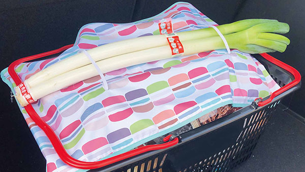 「マイかごKeap」は、マイショッピングかごに取り付けて買い物した商品を保護するアイテム。雨天で屋根のない駐車場を使う際に食品が濡れないだけでなく、直射日光から生鮮食品や冷凍食品を守る。長ねぎやゴボウなど長い野菜を固定できるストッパー付き。シリコンバンドを使って買い物カゴ2箇所に固定する。