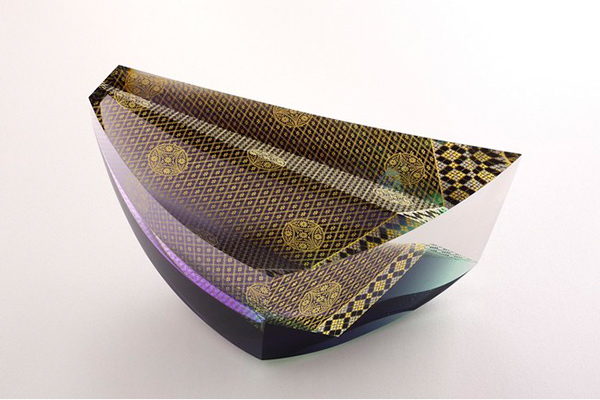 透明なガラスの中に浮遊するかのように截金を封じ込めた“截金ガラス”の作品が紹介される「山本茜展」