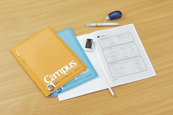 「キャンパスノート(プリント貼付用)」は、B5サイズの用紙を切らずに貼れるサイズのノートで、プリントを貼りやすいように工夫された罫内容で人気。リニューアルにより本文の罫線をドット入り罫線に変更し、目的ごとの色分けがしやすい5色パックを新たに用意する。
