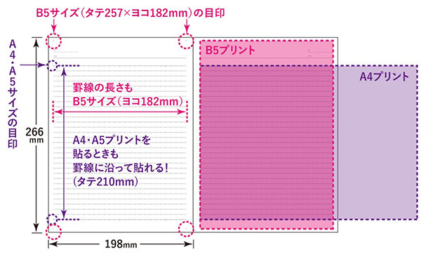 「キャンパスノート(プリント貼付用)」のサイズは266mm×198mm、A罫(ドット入り)は普通横罫(ドット入り)で30行30枚、B罫(ドット入り)は中横罫(ドット入り)で35行30枚となっている。