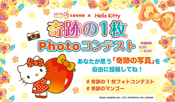 沖縄県宮古島で自社ブランド「奇跡のマンゴー」の生産と販売を行っている宮縁果樹園株式会社は、株式会社サンリオの人気キャラクターであるハローキティとのコラボレーションを記念して「奇跡の1枚Photoコンテスト」を開催中。2021年6月20日(日)の18:00まで、作品の応募を受け付けている。各自が“奇跡”と感じる写真の募集。「ちょっぴり特別な気分になった」「ちょっぴり得しちゃった」「ちょっぴりほっこりした」など、ささやかな奇跡やプチ奇跡も“大歓迎”とされている。