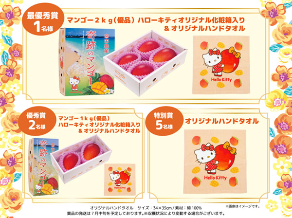 入賞者への賞品には、宮古島産の「奇跡のマンゴー」を用意。最優秀賞(1名)には2kg、優秀賞(2名)には1kgがそれぞれハローキティオリジナル化粧箱入りで贈られ、あわせてオリジナルハンドタオルも贈呈される。さらに、このオリジナルハンドタオルは特別賞(5名)の受賞者にもプレゼント。