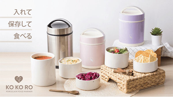 「KOKOROフードジャー」は、磁器容器で使いやすいアイテム。電子レンジが使用できるだけでなく、食べ物から出る熱が真空断熱容器内を循環するので余熱や保温の効果がある。8時間以上の保温と保冷ができる。