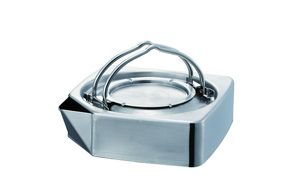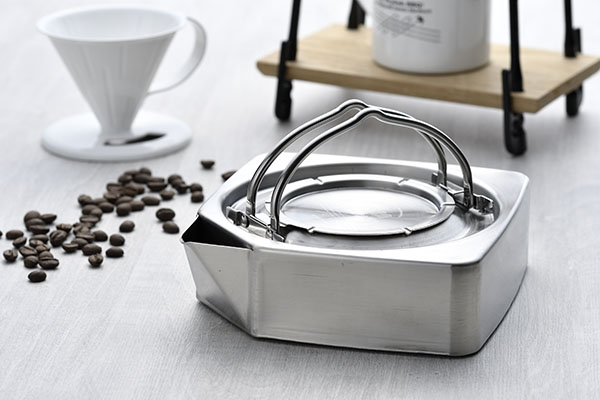 サビにくいオールステンレス製。コーナーの丸みを最小限にした加工することでフォルムを引き立てている。水入れ口にもなる注ぎ口は水垂れしにくい設計なので、コーヒードリップにも対応する。