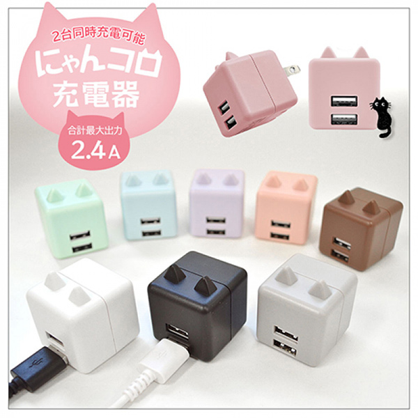 本製品は、キューブ型の本体に猫の耳のような突起を搭載。ちょっとした工夫で、可愛らしさを大幅にアップさせたアイデア製品だ。本体には2基のUSB A出力ポートが実装されており、2ポート合計での最大出力は2.4A。iOSとAndroid OSを自動で識別し、最適な電流で充電できる「Smart IC」も搭載している。