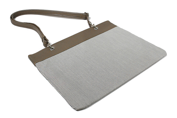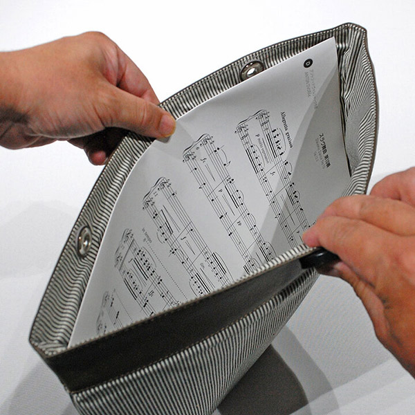 リフィルに入れたり挟んだりという一般的な“楽譜入れ”で必要とされる作業の手間がなく、そのまま楽譜を入れるだけで手軽に使うことが可能。見た目は高級感がありつつ、ストライプ生地で涼しげな印象に仕上げられている。