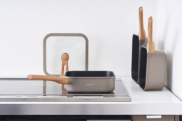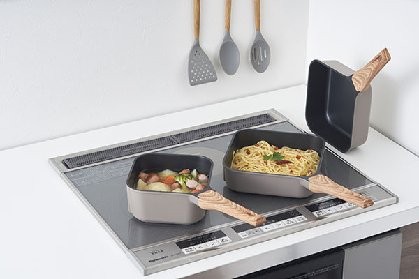 「スマートフライパンsutto(スット)」は、取り出しやすいハンドルやスープや具材が注ぎやすい四角い形状が特徴。レトルトパックや冷凍うどんをきれいに入れやすい。自立するので収納しやすく、洗ったあとに水切りかごへスリムに置ける。煮込み料理や餃子等に役立つシリコーンリング付きガラスふたが付属する。