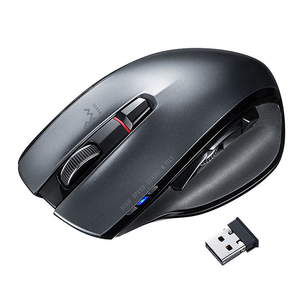 「高速スクロールマウス」は、ホイールを一度回すことで下方までページを下げられる機能を搭載したマウス。スクロール速度はクリック感のある通常モードとスムーズに回る高速モードがあり、切り替えボタンを使い場面に応じて選択できる。カウント切り替えは800・1600の2段階で切り替え可能。サイドスクロールボタンを使って、音量を調整したり専用ソフトで別の機能を割り当てたりすることができる。