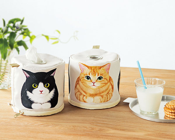 「香箱座り猫さんのロールペーパーホルダー」は、ロールペーパーをセットしてティッシュのように設置できる製品。ロールペーパーをするすると抜き出せるので、愛猫がフードを食べこぼしたり、毛玉を吐いてしまったりなど、大量にペーパーが必要な場面に役立つ。