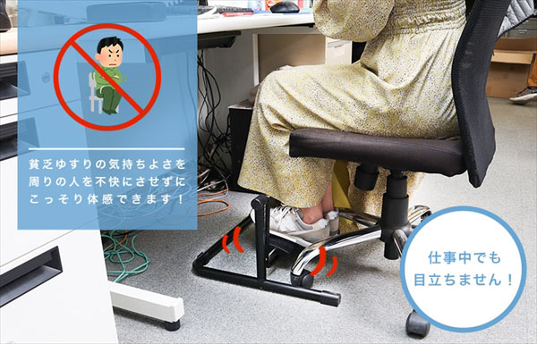 「足プラーンコ」は、椅子に座っている際に足をリラックスできるアイテム。リラックスだけでなく、貧乏ゆすり防止にも役立つ。ブランコのように足を動かせるので、デスクワーク中のストレッチなどに便利だ。
